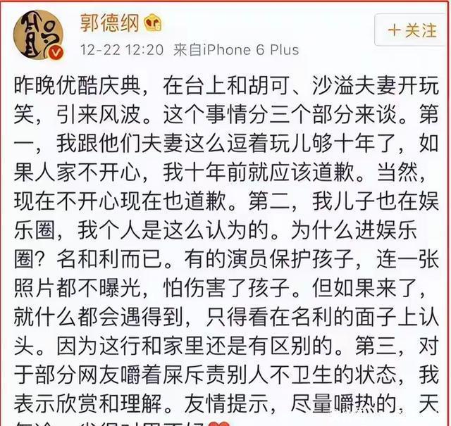 第二天网友的评论都炸锅了,认为郭德纲不应该在这么小的孩子面前调侃,郭德纲回复说在娱乐圈什么都会遇到,只得看在名和利面子上认头,还说网友嚼舌根。
