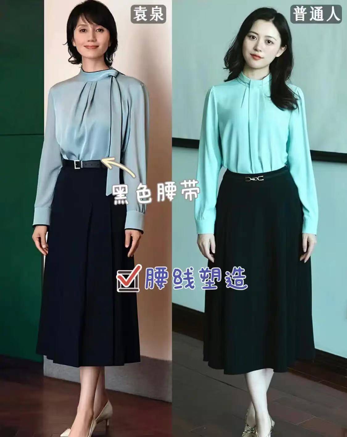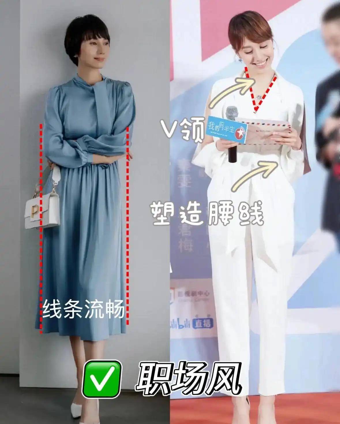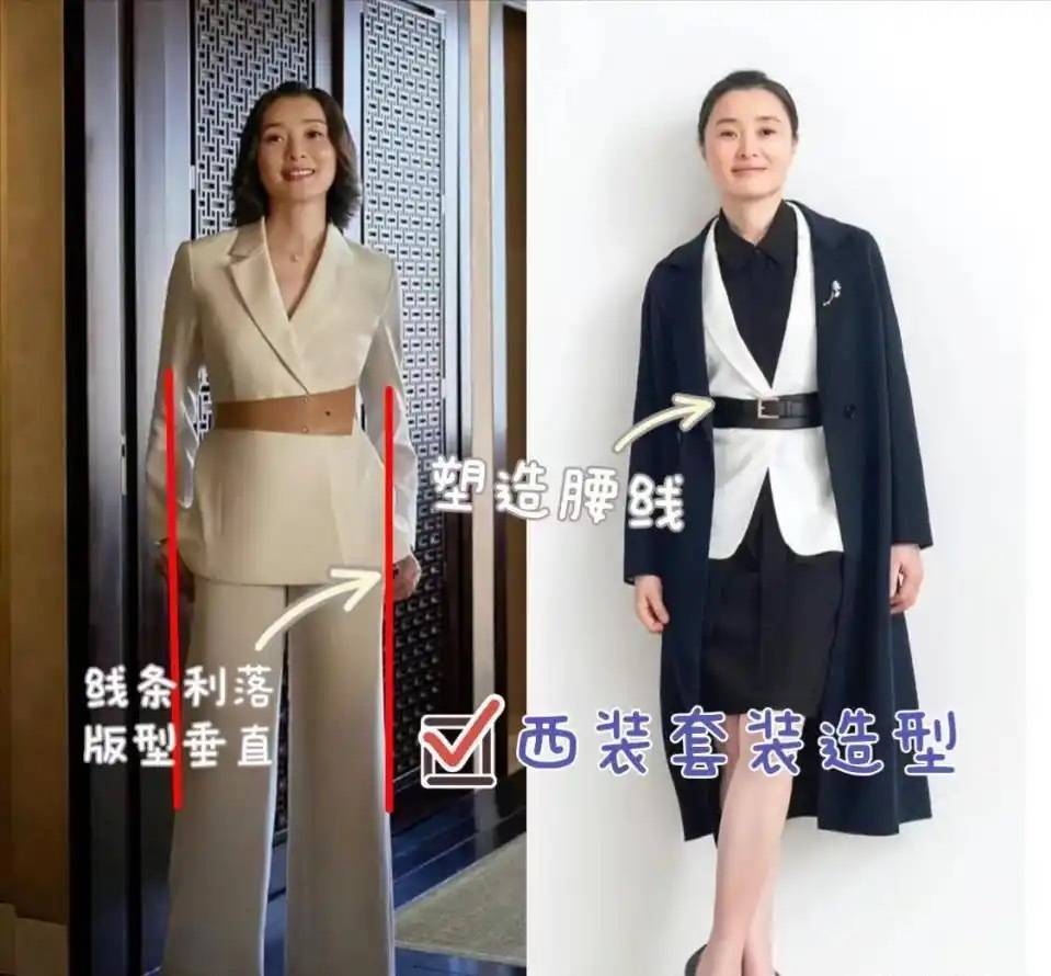 袁泉的穿搭示范:连衣裙或者套装自带的腰线巧妙把袁泉的比例完美展现出来,与短发结合的造型,显高又不失时尚感。