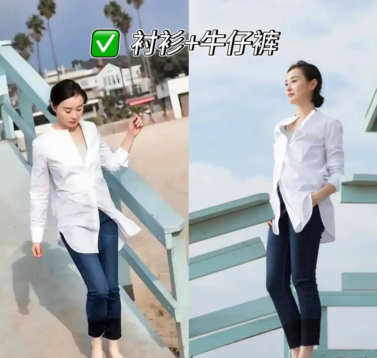 吴越的低马尾绑发造型常常搭配衬衫+牛仔裤,这个方法简单却极其有效。选择与衬衫颜色协调的内搭,整体色彩协调又统一,瞬间提升整体造型的精致度。