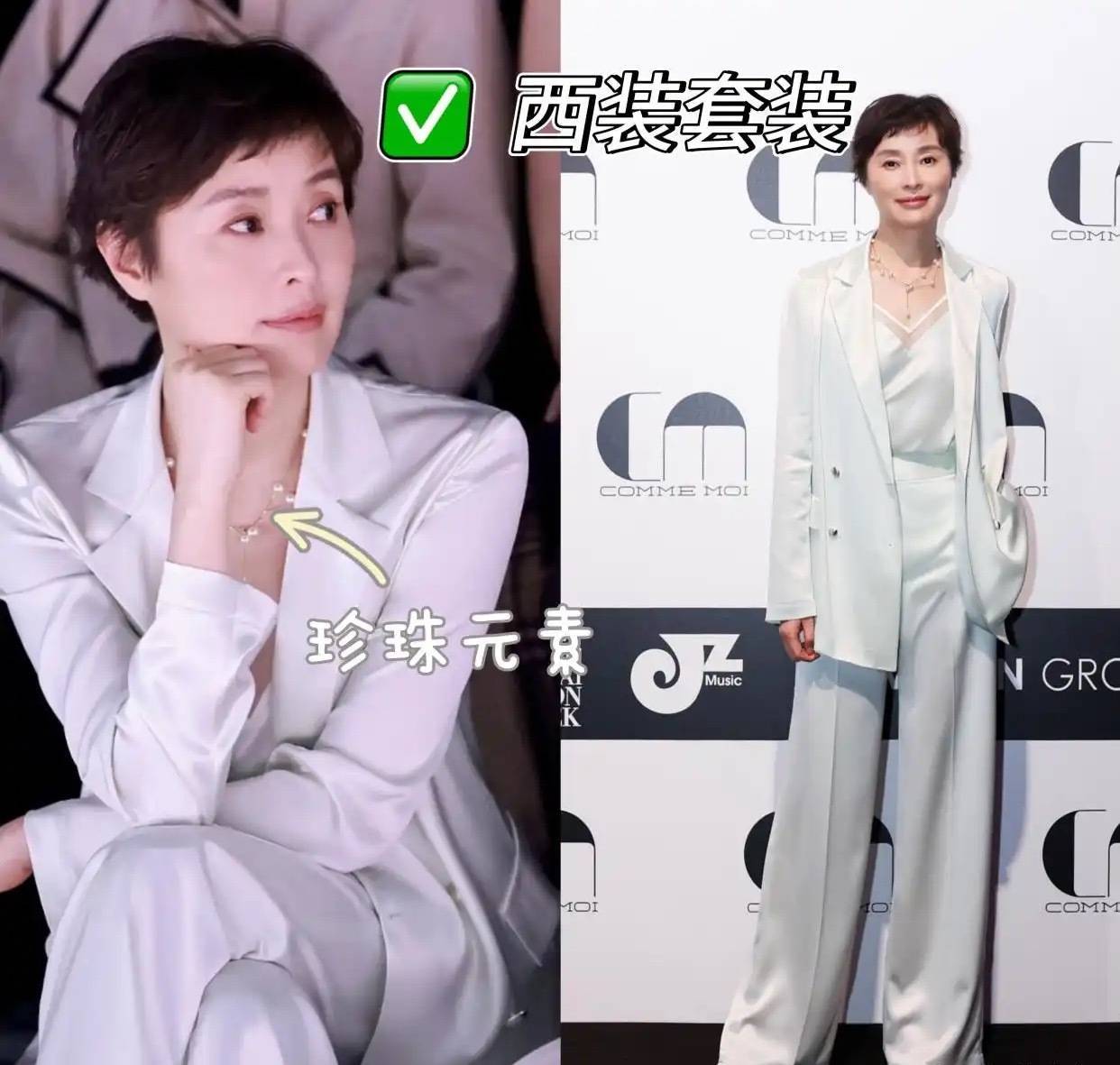 吴越经典的假小子发型非常适合职场女性。她的假小子发型中,选择剪裁合体的西装套装,佩戴简约设计的珍珠项链,既能展现精致感,又不会过于张扬,与发型的慵懒感相得益彰。